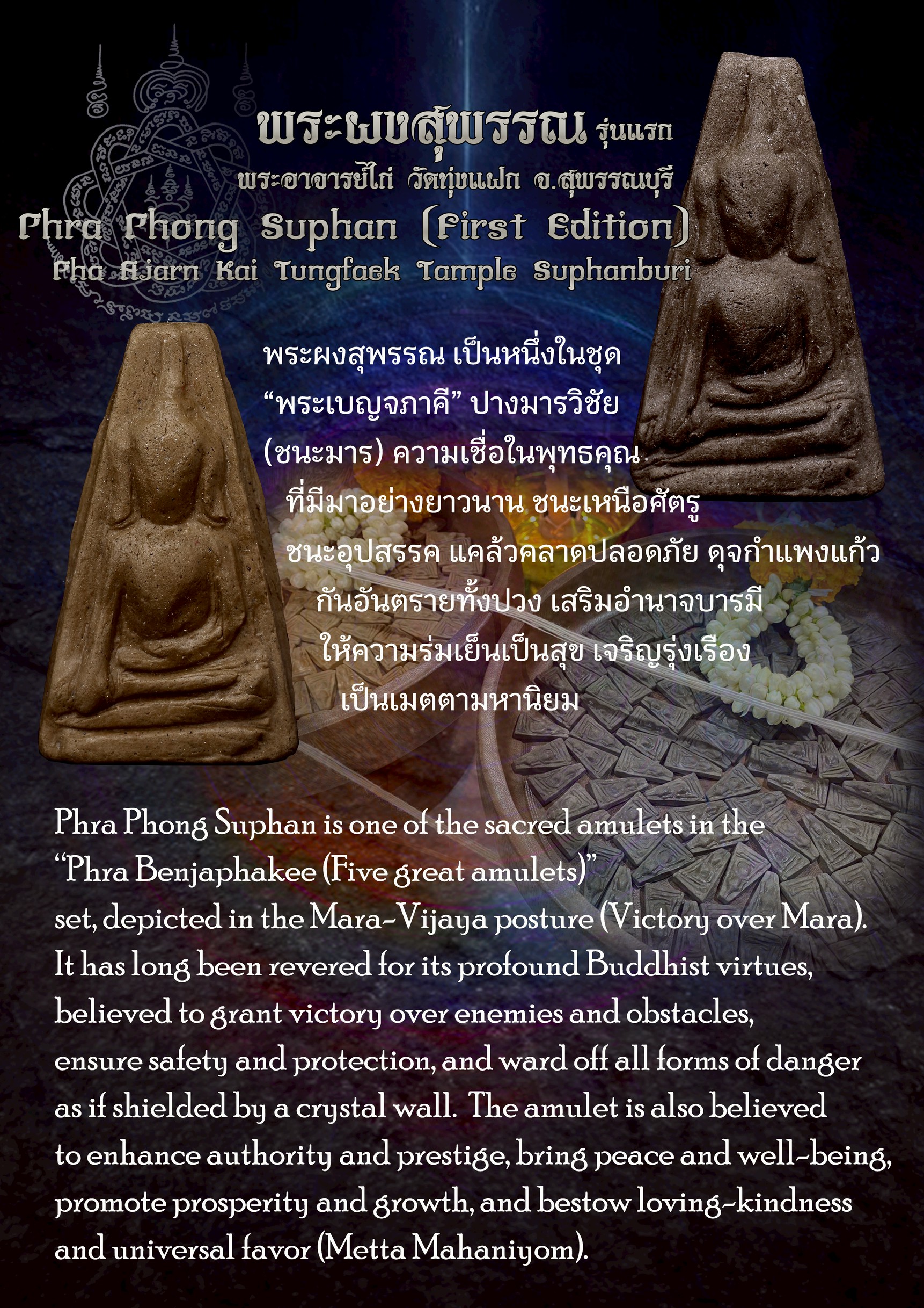 Phra Phong Suphan is one of the sacred amulets in the “Phra Benjaphakee (Five great amulets)” set, depicted in the Mara-Vijaya posture (Victory over Mara). It has long been revered for its profound Buddhist virtues, believed to grant victory over enemies and obstacles, ensure safety and protection, and ward off all forms of danger as if shielded by a crystal wall. The amulet is also believed to enhance authority and prestige, bring peace and well-being, promote prosperity and growth, and bestow loving-kindness and universal favor (Metta Mahaniyom).