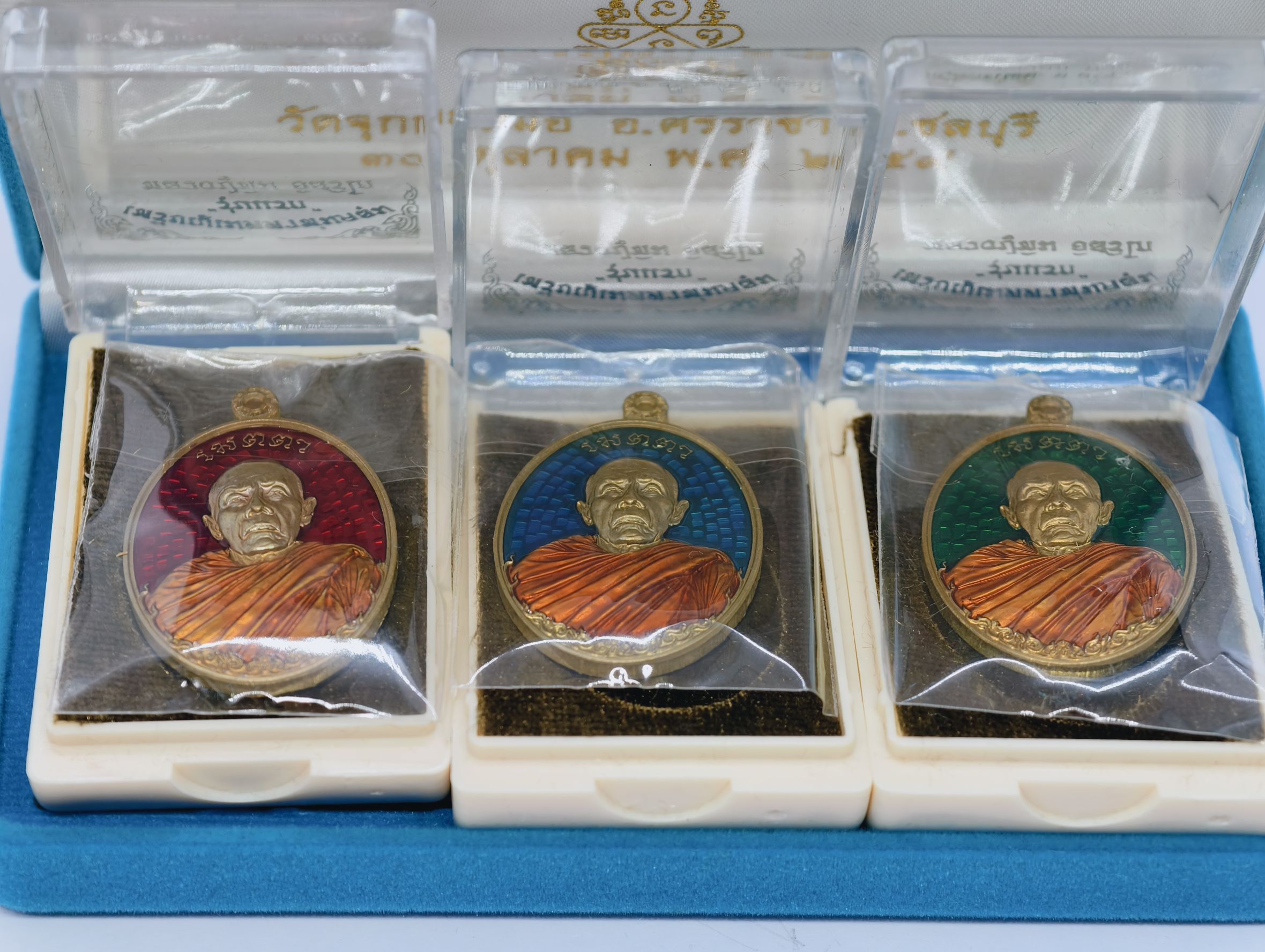 หลวงปู่ทิม วัดละหารไร่ ยกชุด ห่มคลุม รุ่นแรก หลวงพ่อฟู หลวงพ่อสิน ปลุกเสก ชุดลงยา 3 องค์ KA3726