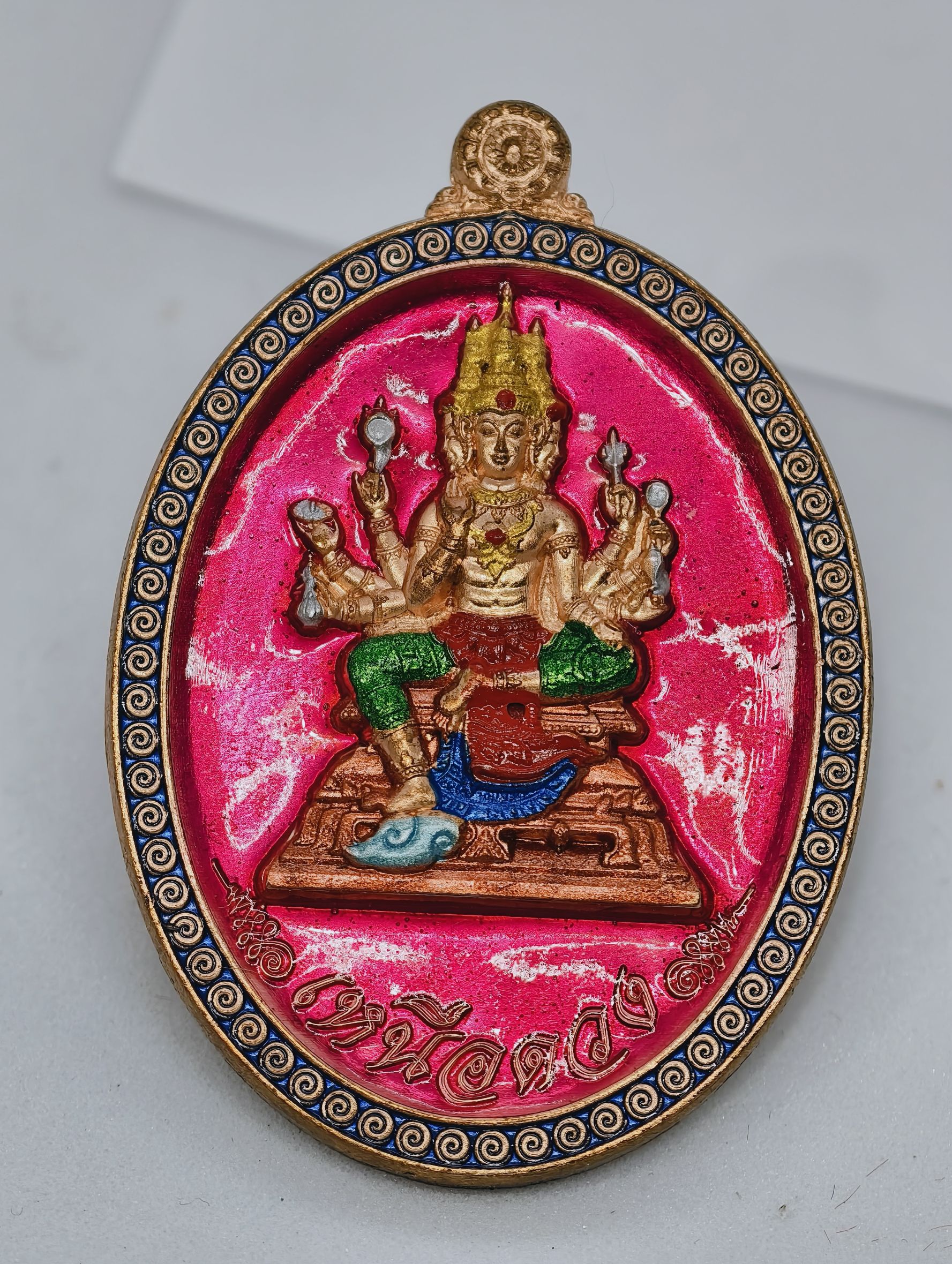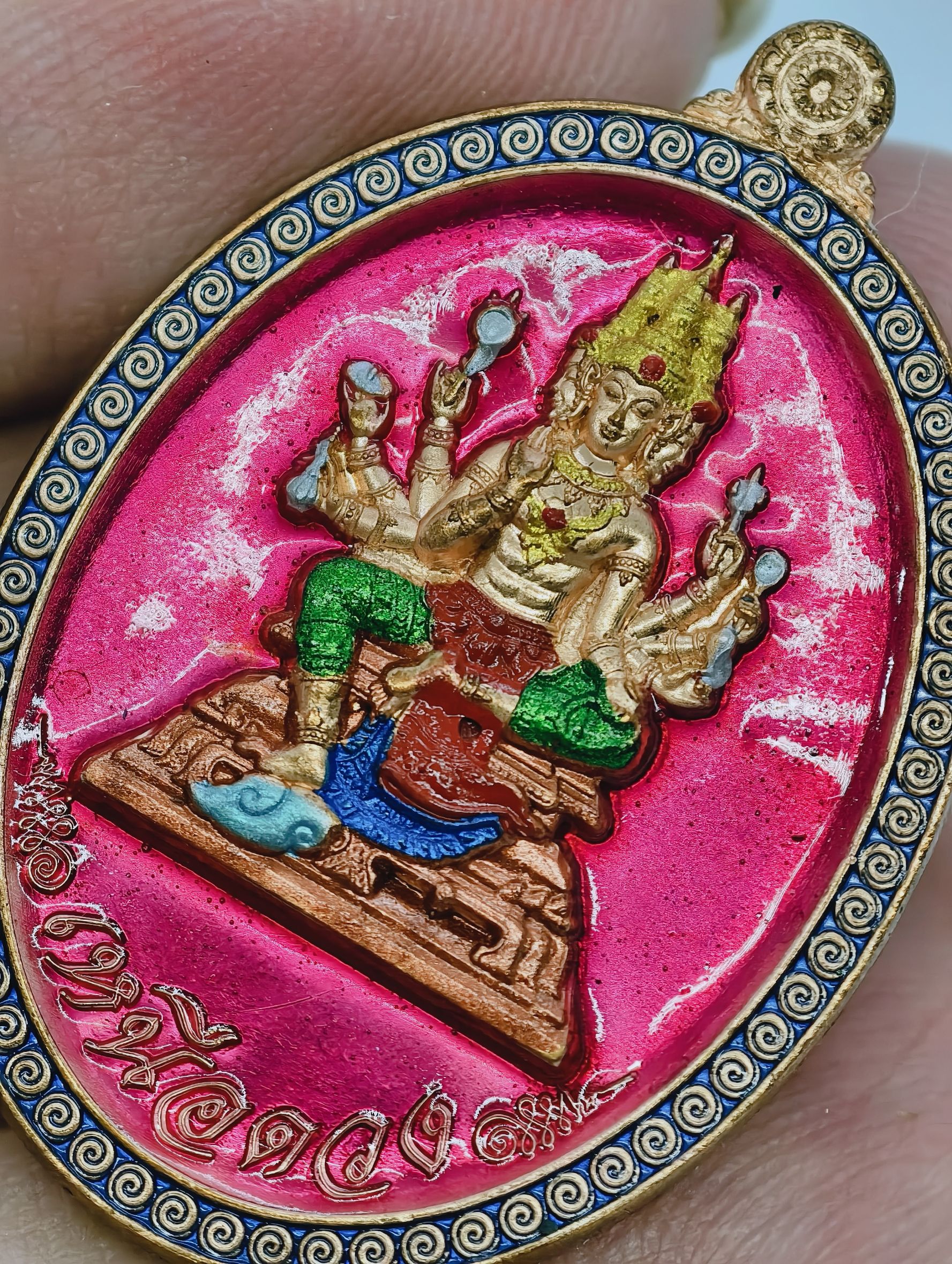 หลวงปู่มหาศิลา วัดพระธาตุหมื่นหิน พระพรหมเหนือดวง ลงยา ชมพู KA3389