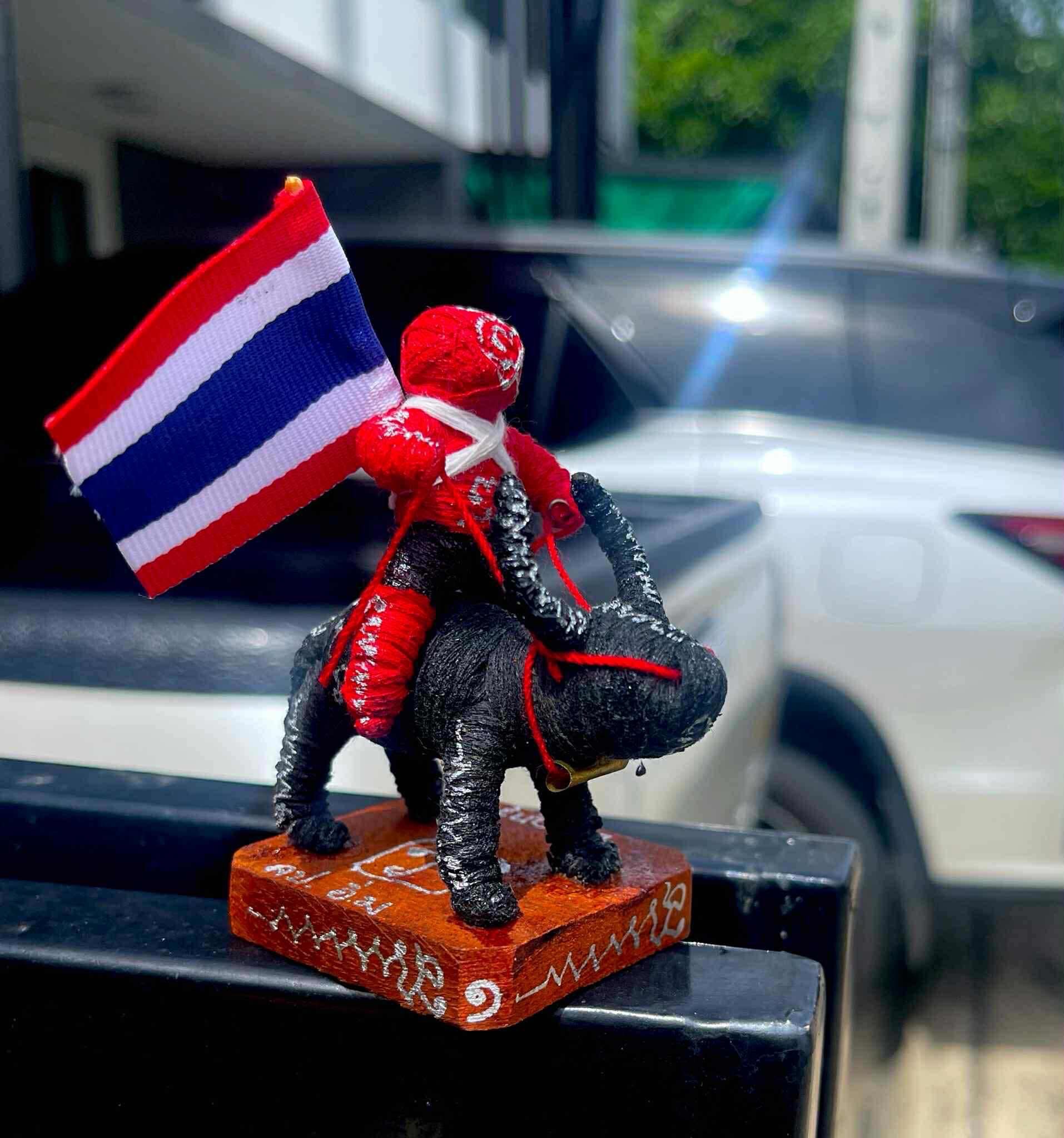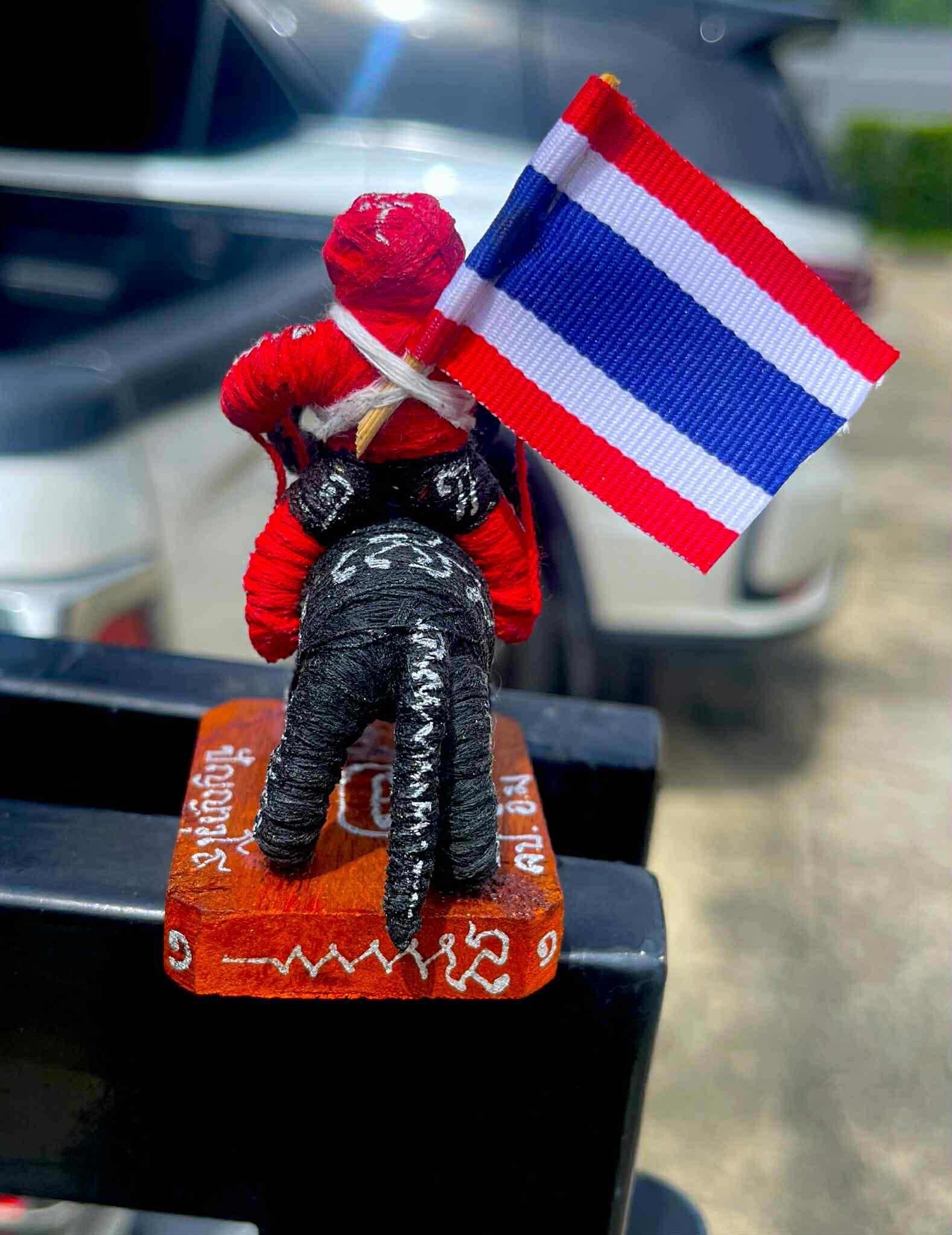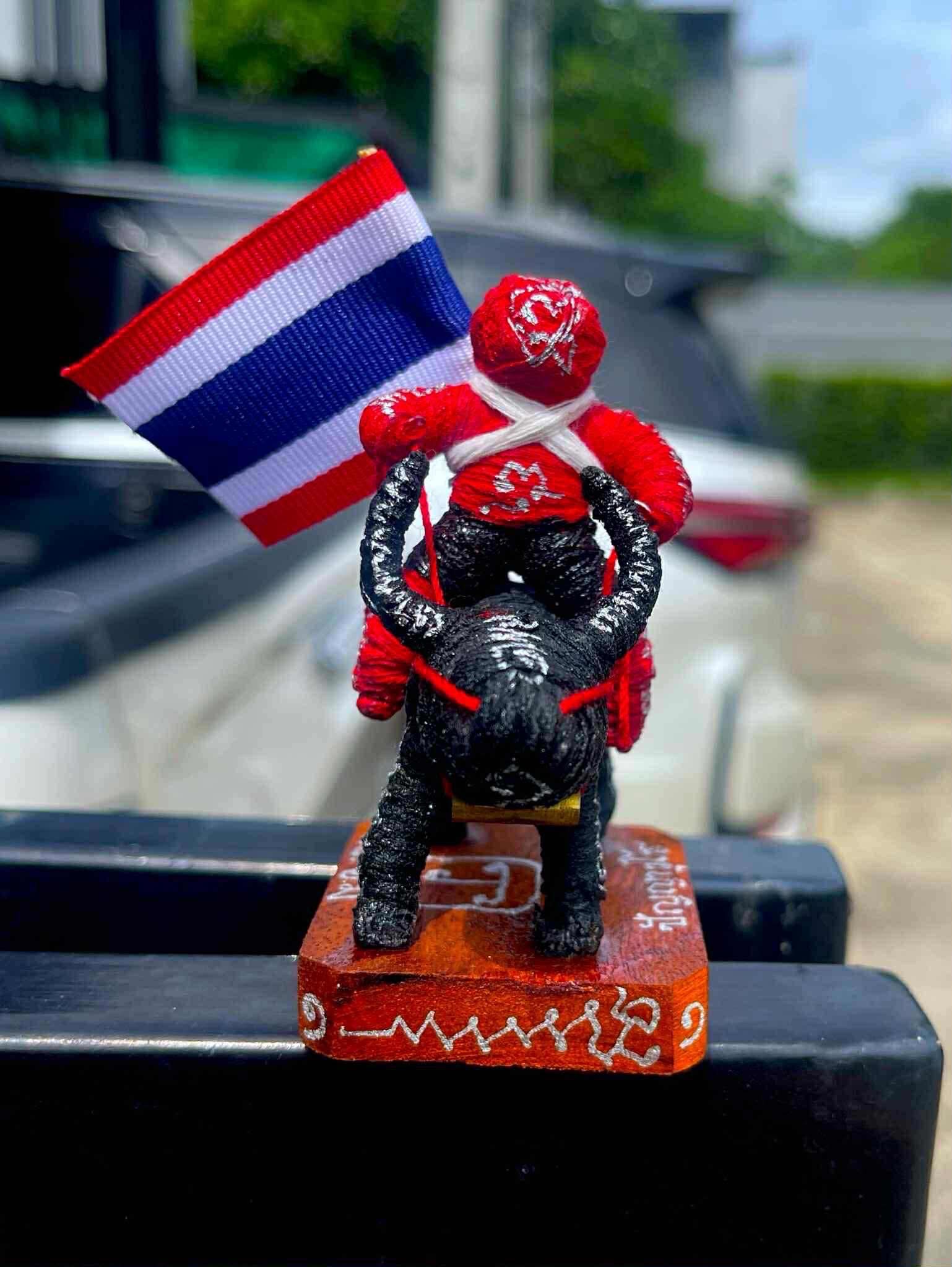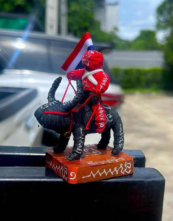 เป็นหุ่นพยนต์ถักเชือกลงยันต์เต็มตัว ขี่ควายแบกธงชาติ มีเลขรันนัมเบอร์ทุกตน