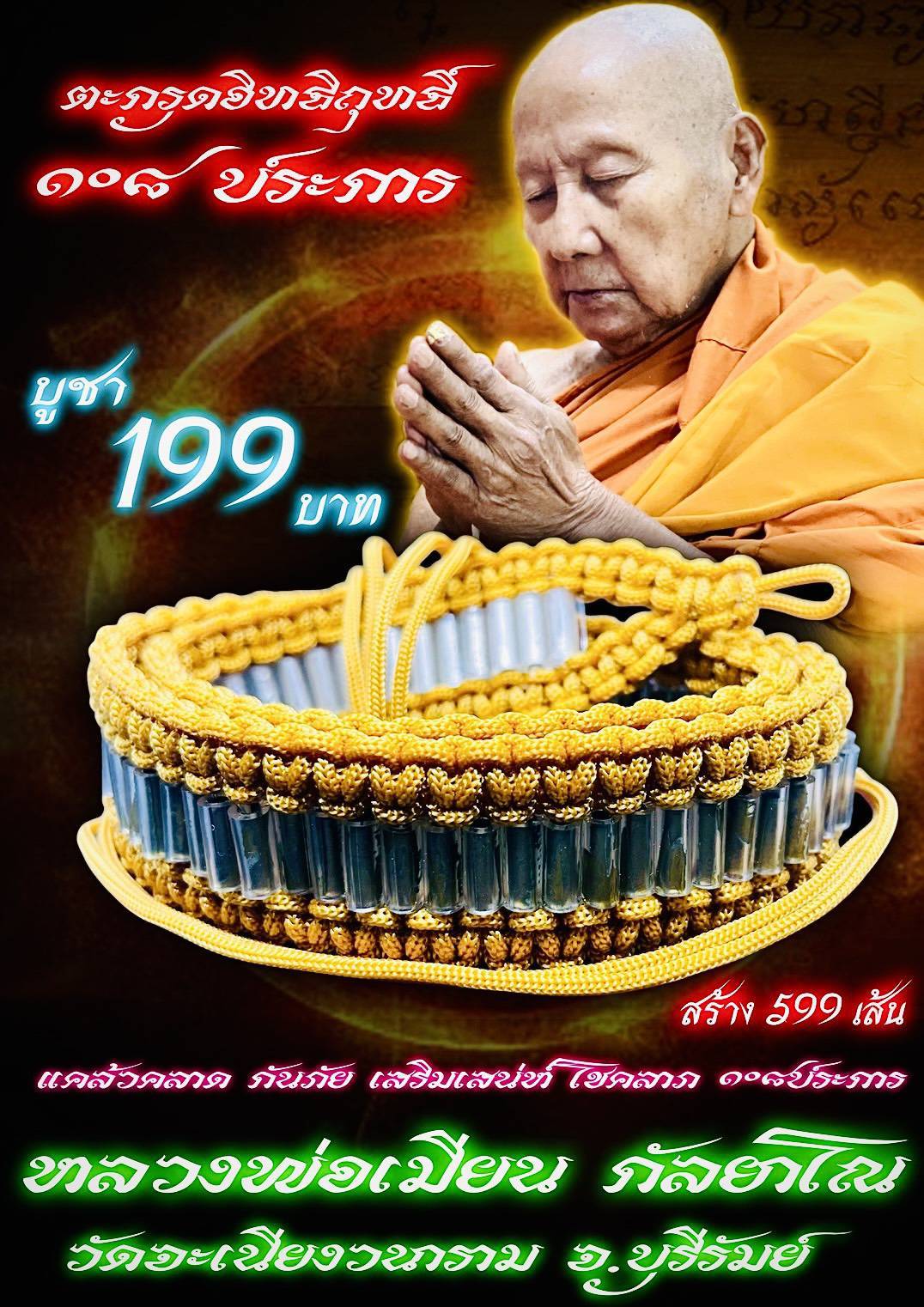 ตะกรุดอิทธิฤทธิ์ ๑๐๘ ประการ เป็นตะกรุดที่อธิษฐานจากตะกรุดดอกเล็ก 108 ดอกร้อยเรียงรวมกันเป็นสร้อยสังวาล อธิษฐานจิตได้มากมาย ทั้งเรื่อง แคล้วคลๅด คงกระพัน กันภัย เสริมเสน่ห์เมตตาโชคลาภได้ 108 ประการ ตามใจอธิษฐาน ได้รับการปลุกเสกโดย หลวงพ่อเมียน กัลยาโณ วัดจะเนียงวนาราม