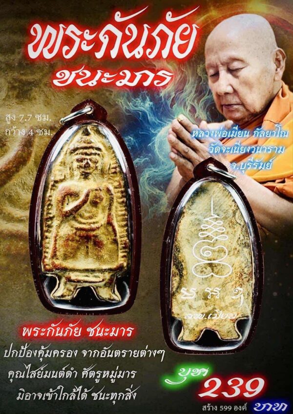 พระกันภัยชนะมาร พระเครื่องที่โดดเด่นในเรื่องการป้องกันคุ้มครองจากภัยอันตรายต่างๆ อๅถรรพ์ ลมเพลมพัด ศัตรูหมู่มาร มิอาจเข้าใกล้ได้ ชนะทุกสิ่ง ทุกอุปสรรคต่างๆ เรียกได้ว่าโดดเด่นในทางนิรันตราย สร้างย้อนยุคเลียนแบบพระกรุโบราณ ผสมเนื้อชินเก่า ปลุกเสกโดย หลวงพ่อเมียน กัลยาโณ วัดจะเนียงวนาราม จังหวัดบุรีรัมย์ พระเกจิอาจารย์แห่งดินแดนอีสานใต้ผู้ได้รับการยกย่องและเป็นที่นับถือจากลูกศิษย์ทั้งในประเทศไทยและ ต่างประเทศ อธิษฐานจิตปลุกเสกให้เป็นอย่างดี เพื่อคุ้มครองป้องกันกับผู้ที่บูชา ผู้ที่เคารพศรัทธา