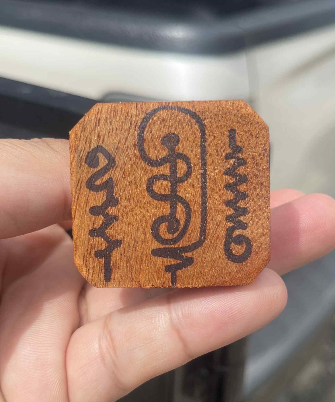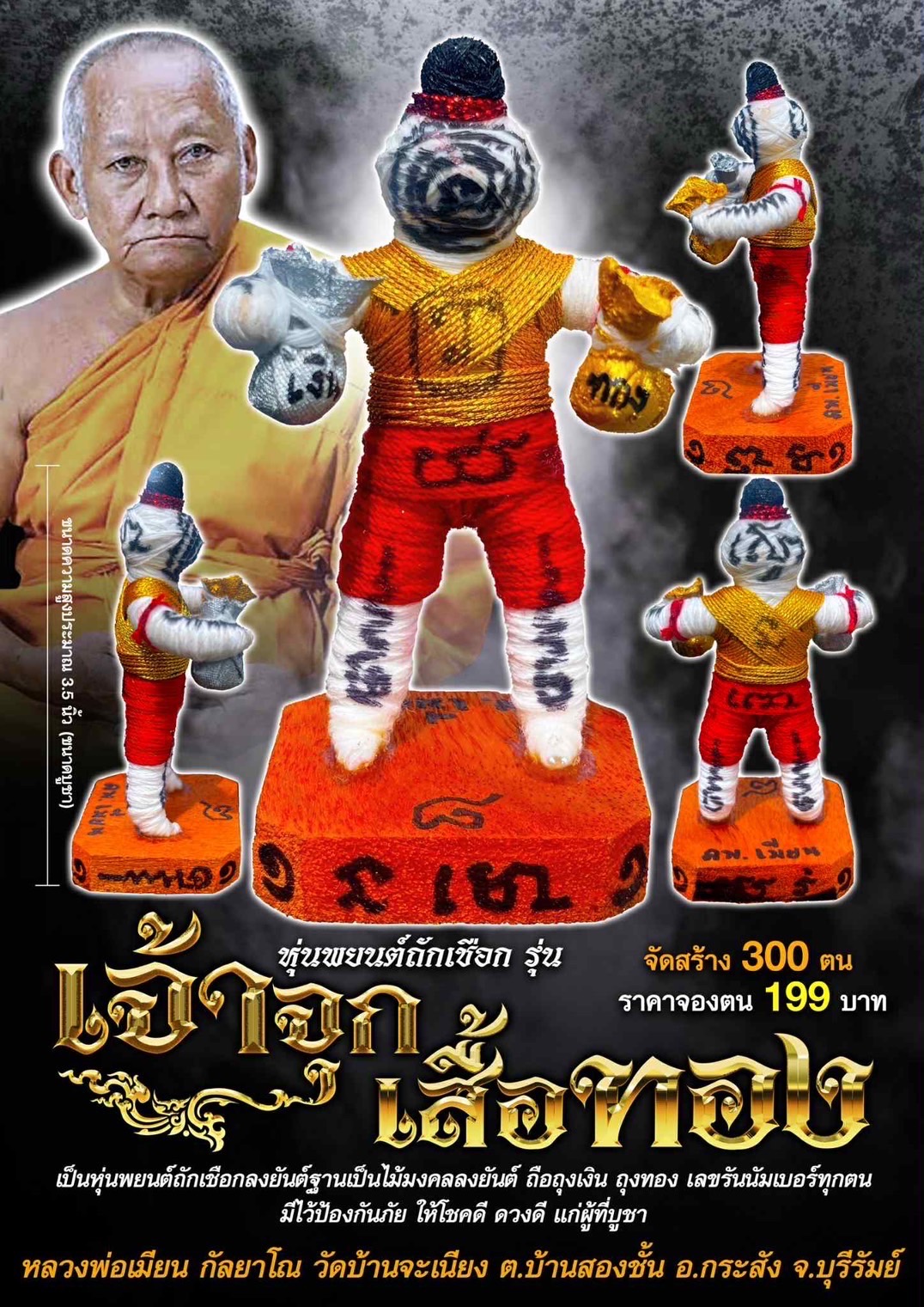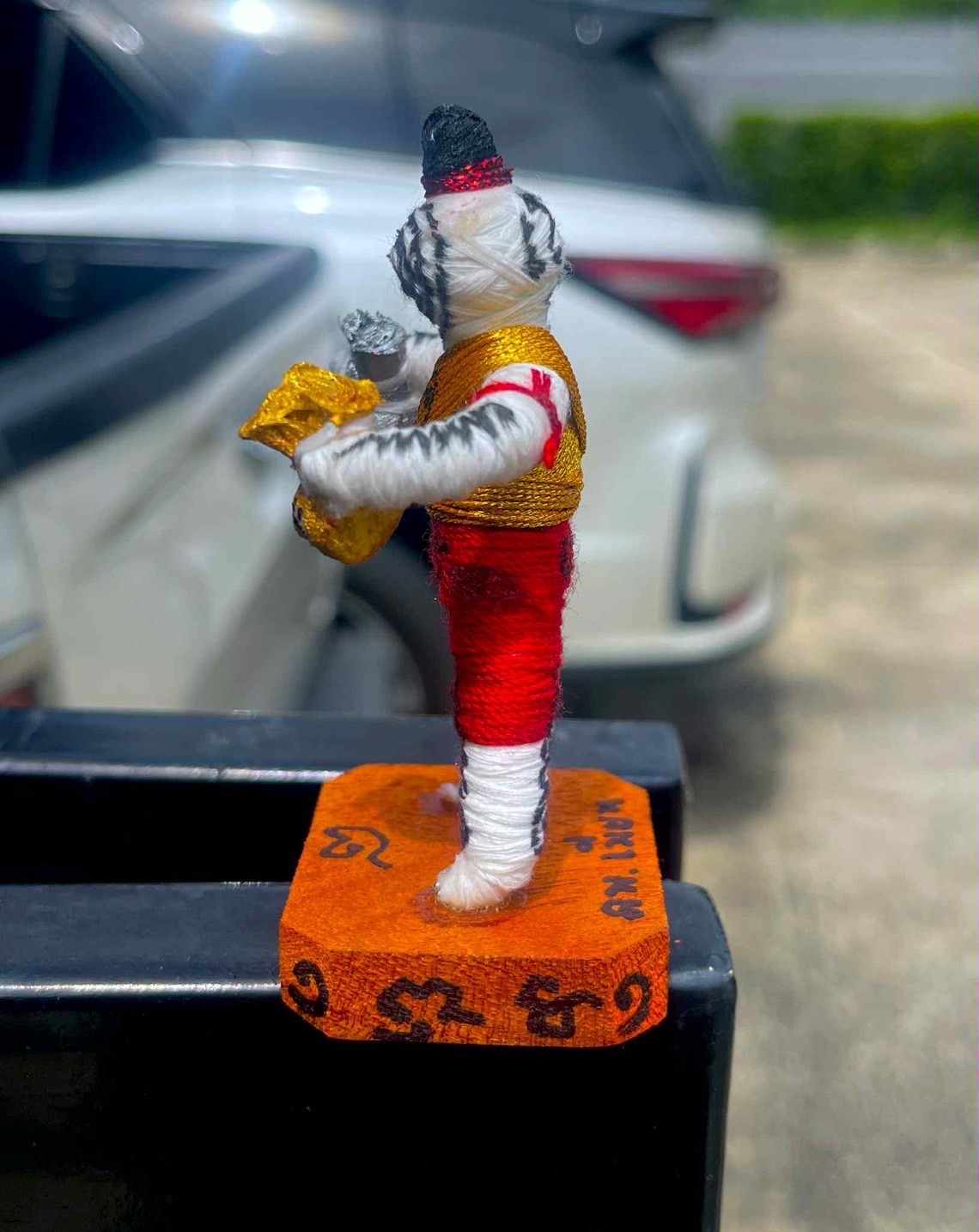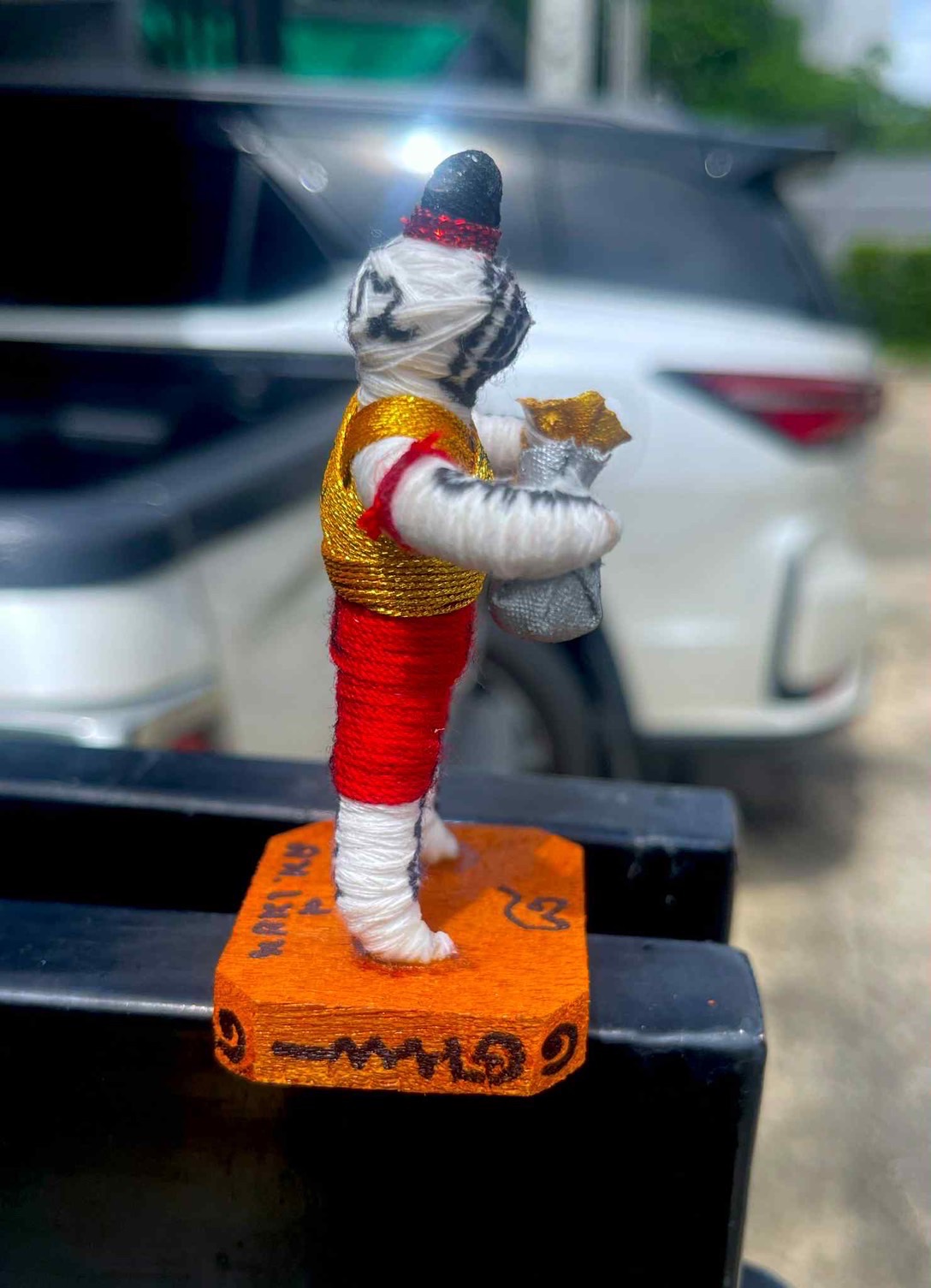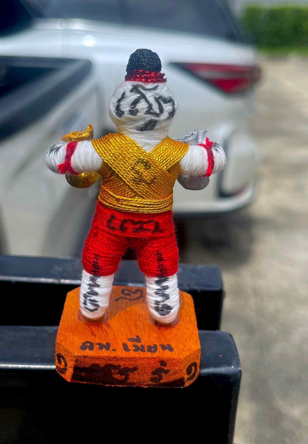 เป็นหุ่นพยนต์ถักเชือกลงยันต์ฐานเป็นไม้มงคลลงยันต์ ถือถุงเงิน ถุงทอง เลขรันนัมเบอร์ ทุกตน
