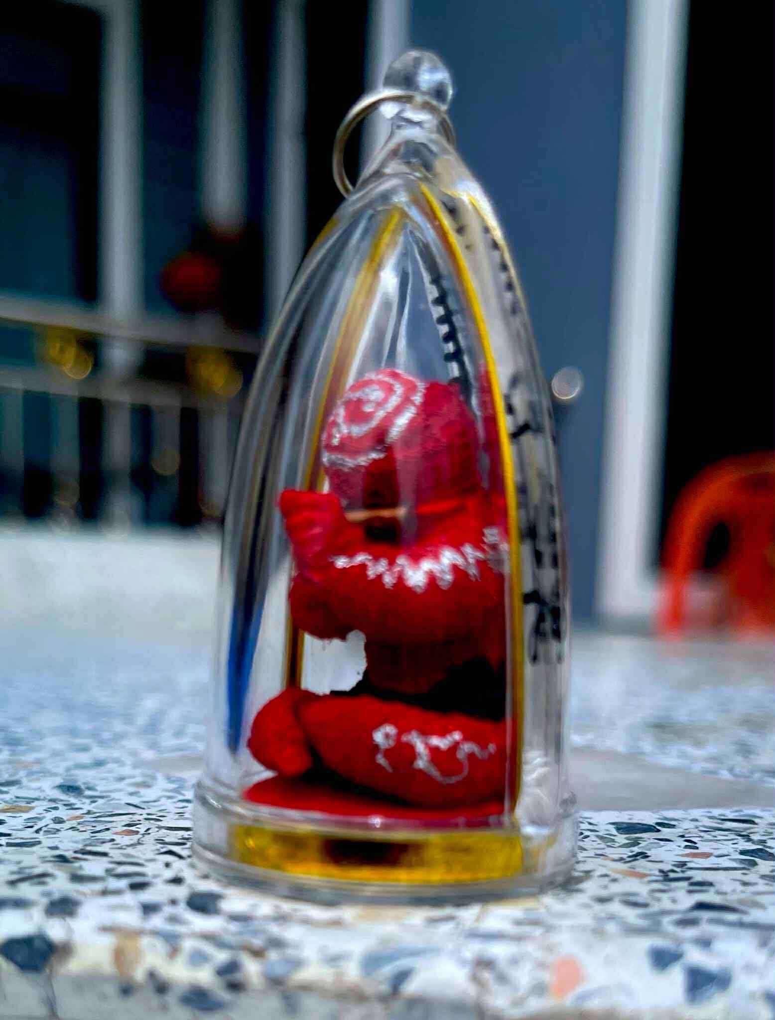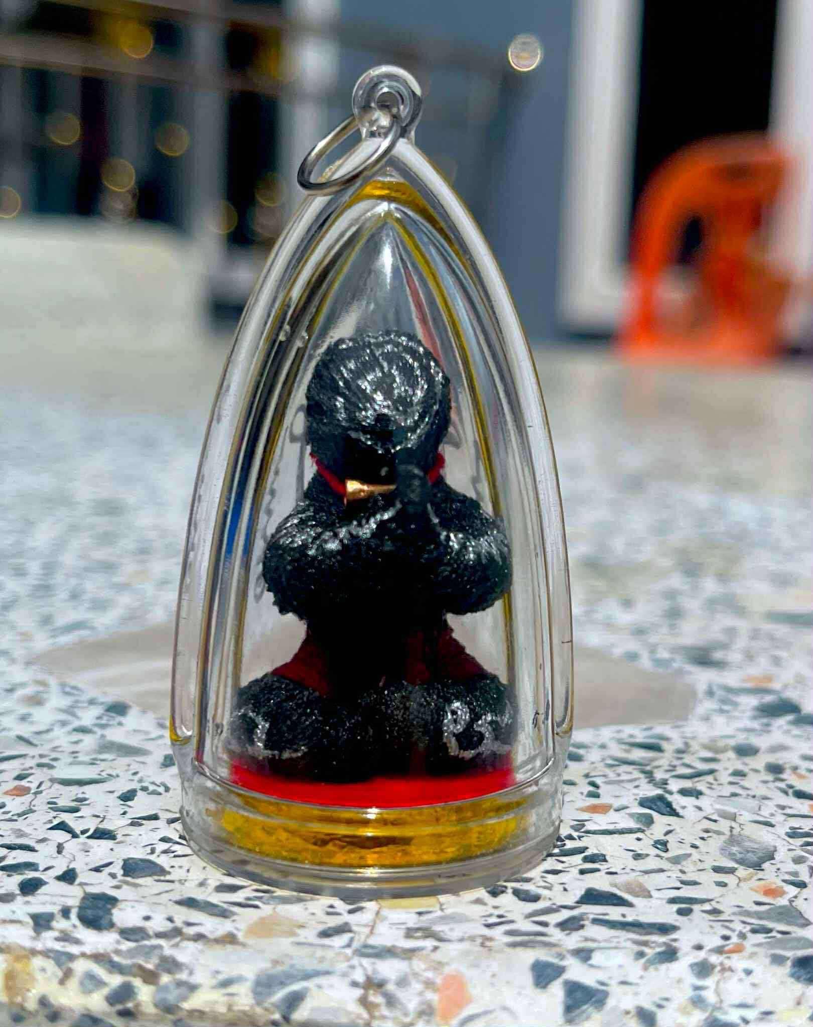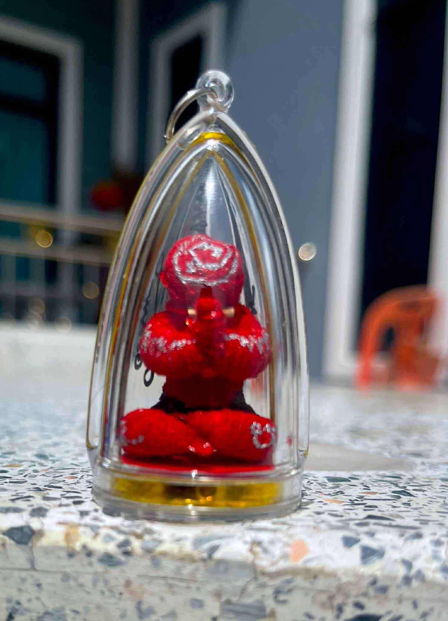 เป็นหุ่นพยนต์ถักเชือกลงยันต์เต็มตัว และด้านนอกกรอบ รูปนั่งพนมมืออยู่ในกรอบพลาสติกใสพร้อมใช้ได้เลย มีเลขรันนัมเบอร์ทุกตนที่ ตะกรุดห้อยคอ