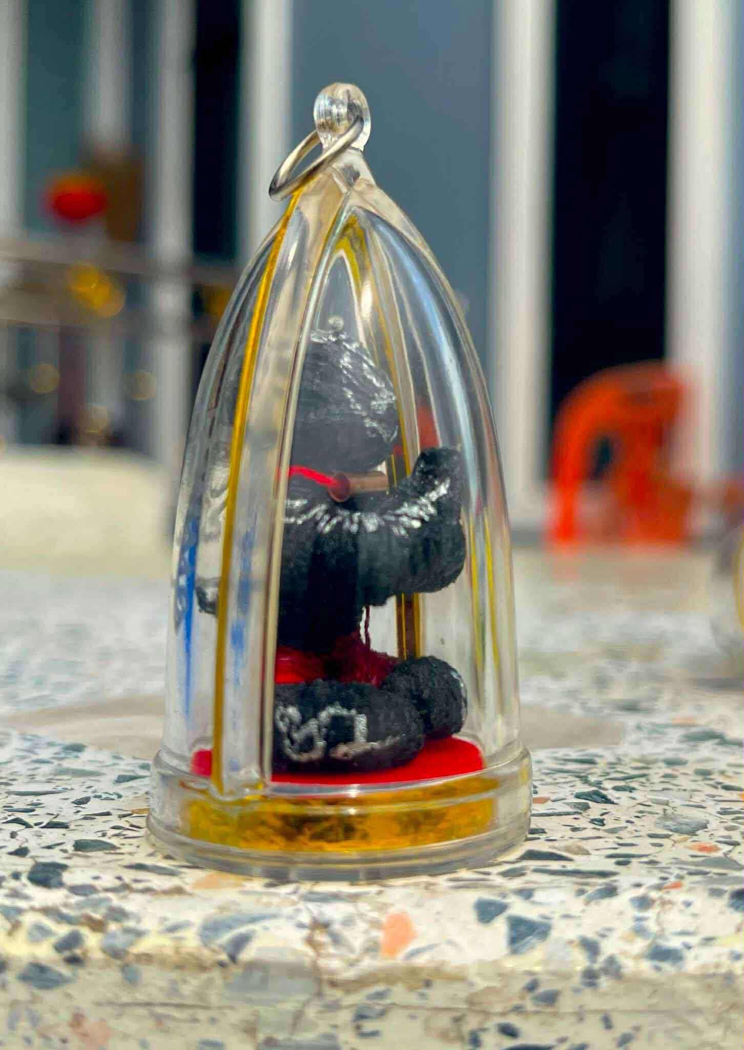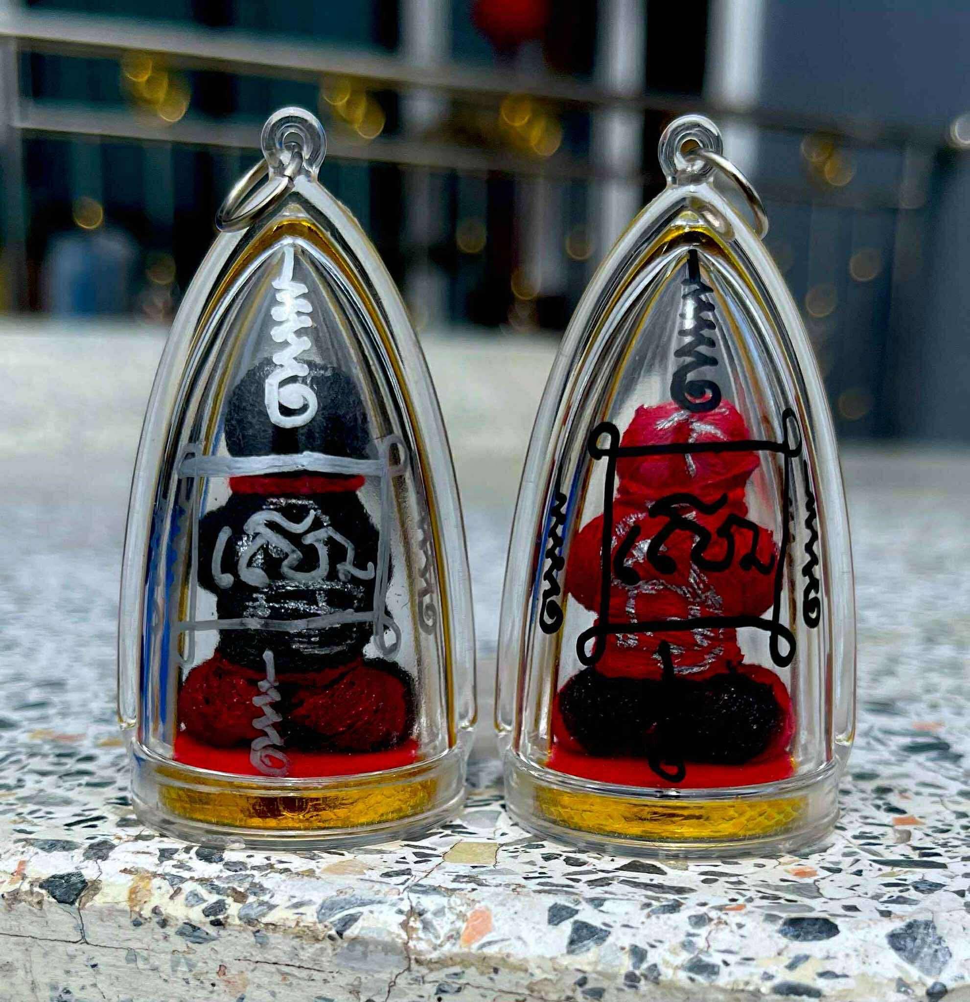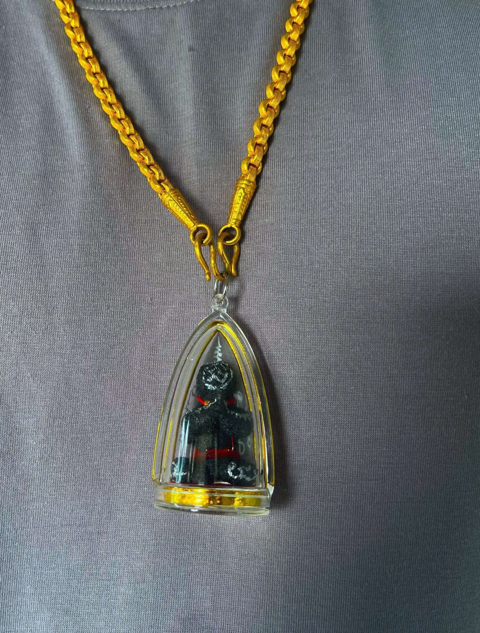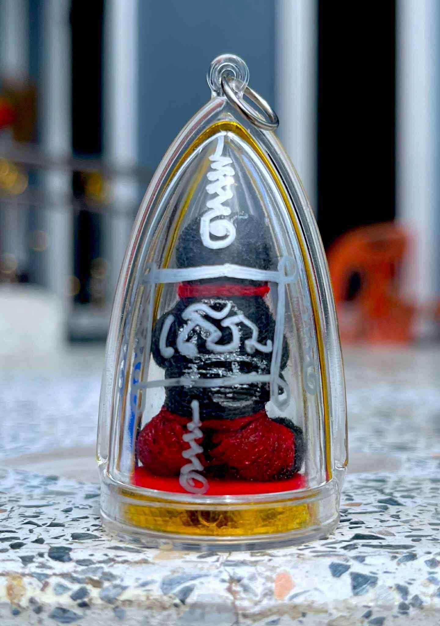เป็นหุ่นพยนต์ถักเชือกลงยันต์เต็มตัว และด้านนอกกรอบ รูปนั่งพนมมืออยู่ในกรอบพลาสติกใสพร้อมใช้ได้เลย มีเลขรันนัมเบอร์ทุกตนที่ ตะกรุดห้อยคอ