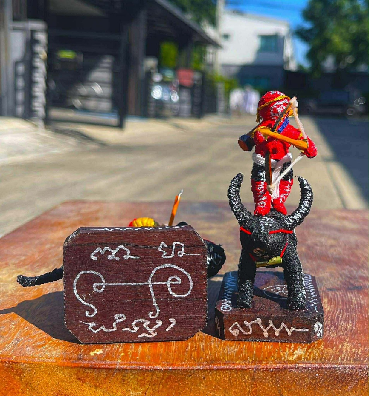 เป็นหุ่นพยนต์ถักเชือกลงยันต์เต็มตัว ขี่ควายยืนยิงธนูมีเลขรันนัมเบอร์ทุกตน