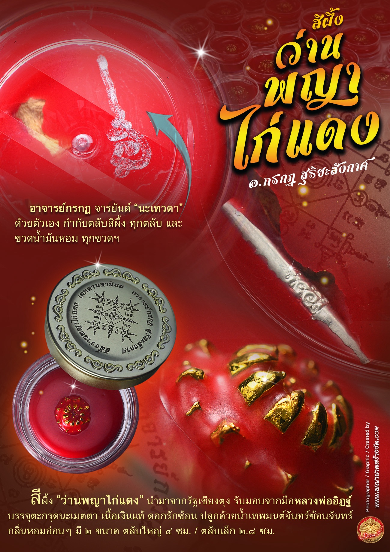 สีผึ้ง “ว่านพญาไก่แดง” นำมาจากรัฐเชียงตุง รับมอบจากหลวงพ่ออิฏฐ์ ภทฺทจาโร ผสมหัวเชื้อสีผึ้งหลวงพ่อคง วัดบางกะพ้อม และสีผึ้งเขียวเกี้ยวสาว หลวงพ่อทาบ วัดกระบกขึ้นผึ้ง